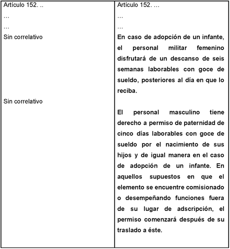 Sin embargo, las licencias de maternidad para el personal de las fuerzas armadas no se reflejaron hasta 2019. En 1976 se promulgó la Ley del Instituto de Seguridad Social para las Fuerzas Armadas Mexicanas que, si bien otorgaba prestaciones de seguridad social y pensiones al personal militar y sus familias, no se reconocieron derechos en caso de maternidad.
