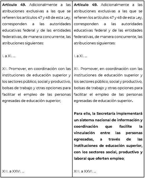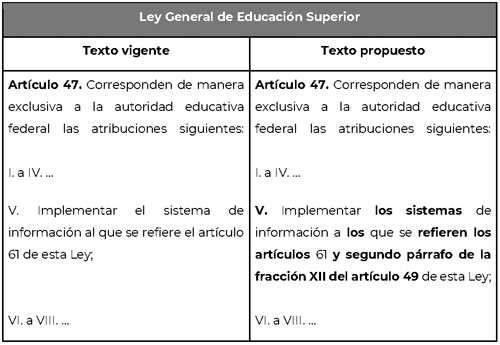 Por lo anterior, se propone adicionar un párrafo segundo al artículo 49 y reforma la fracción V del artículo 47 de la Ley General de Educación Superior, de acuerdo con la siguiente