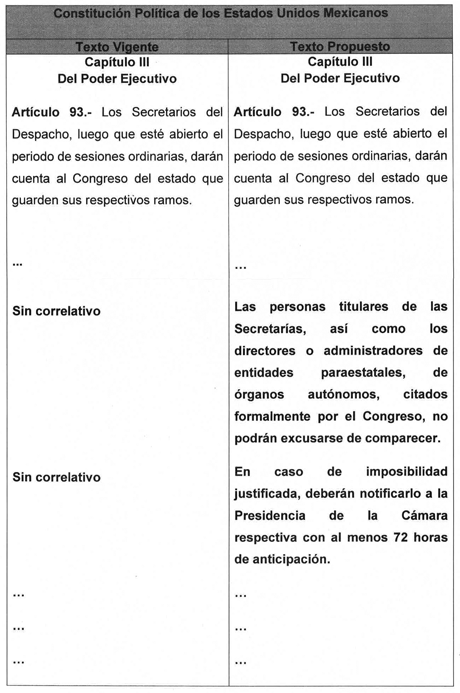 95. No obstante, este Tribunal Pleno considera que las porciones normativas reclamadas transgreden el principio de división de poderes tal como fue solicitado por los diputados promoventes, pues a pesar de que tiene un respaldo jurídico en el artículo 93 de la Constitución federal como lo argumentaron las Cámaras de Diputados y Senadores, el cual permite las comparecencias de los secretarios de Estado ante el Congreso de la Unión, la obligación impuesta al Secretario de Gobernación es desacorde con el contenido del propio precepto constitucional 6 .