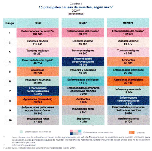 El Instituto Nacional de Estadística y Geografía (INEGI) dio a conocer las cifras preliminares de las Estadísticas de Defunciones Registradas (EDR) que corresponden a 2024, donde las enfermedades del corazón, la diabetes mellitus y los tumores malignos fueron las tres primeras causas de defunción a nivel nacional, tanto para mujeres como para hombres.