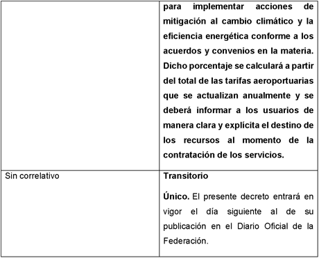 Los transportistas, operadores aéreos concesionarios y permisionarios deberán destinar el cinco por ciento de lo recaudado mensualmente por las tarifas fijadas para implementar acciones de mitigación al cambio climático y la eficiencia energética conforme a los acuerdos y convenios en la materia. Dicho porcentaje se calculará a partir del total de las tarifas aeroportuarias que se actualizan anualmente y se deberá informar a los usuarios de manera clara y explícita el destino de los recursos al momento de la contratación de los servicios.