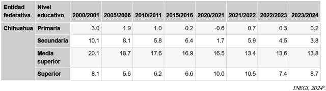 En el caso específico de Chihuahua, el porcentaje de alumnos que abandonó la escuela durante el ciclo escolar en los niveles de educación media superior y superior, incrementó del siclo escolar 2022/2023 al del siguiente año: