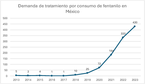 En el Informe de la demanda y oferta de Fentanilo en México: generalidades y situación actual encontraos que los primeros registros documentados del consumo de fentanilo en México abarcan el período entre 2013 y 2017, cuando ocasionalmente se reportaban casos en centros de tratamiento donde los usuarios mencionaban el consumo de medicamentos legales fuera de un contexto médico. A partir de 2018, el número de casos atendidos en los que el fentanilo, principalmente de origen ilícito, era la sustancia psicoactiva principal ha ido en aumento, alcanzando decenas de casos hasta 2020 y superando las centenas desde 2021.