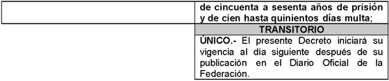 Único. El presente decreto entrará en vigor al día siguiente al de su publicación en el Diario Oficial de la Federación.