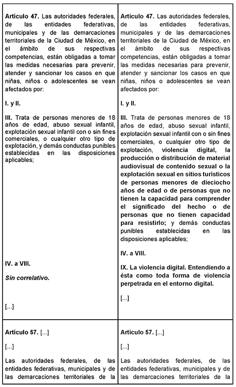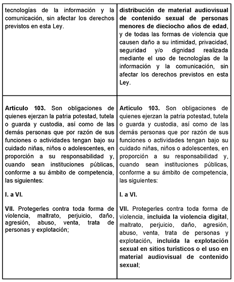 Por lo anteriormente expuesto, probado y fundado, la presente iniciativa consiste en reformar y adicionar los artículos 13, 46, 47, 57, 76, 101 Bis, 101 Bis 2, 101 Bis 3 y 103 de la Ley General de los Derechos de Niñas, Niños y Adolescentes, con el fin de reconocer explícitamente el derecho a un entorno digital seguro, reconocer la violencia digital y establecer obligaciones de prevención ante riesgos, tal como se muestra en el siguiente cuadro comparativo: