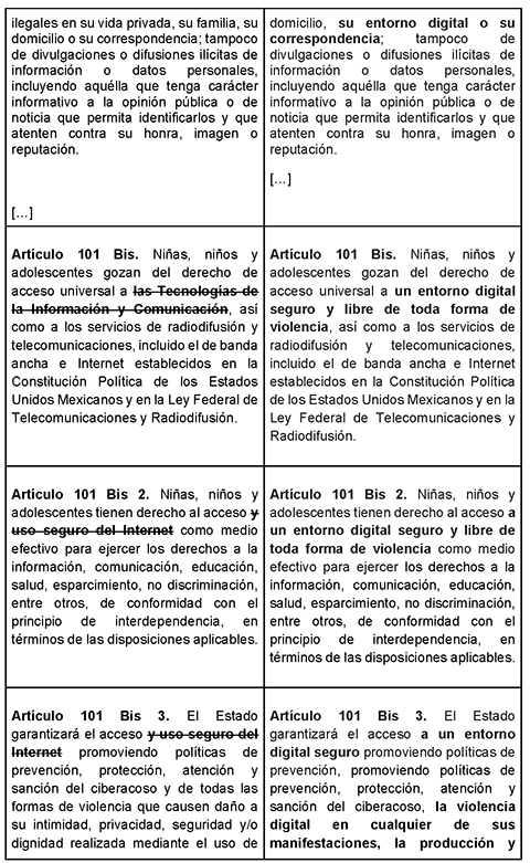 Artículo 101 Bis. Niñas, niños y adolescentes gozan del derecho de acceso universal a un entorno digital seguro y libre de toda forma de violencia, así como a los servicios de radiodifusión y telecomunicaciones, incluido el de banda ancha e Internet establecidos en la Constitución Política de los Estados Unidos Mexicanos y en la Ley Federal de Telecomunicaciones y Radiodifusión.