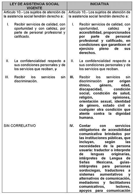 Este enfoque integral contrasta con la situación de la legislación mexicana. Si bien existen normas que establecen derechos a la accesibilidad y a la comunicación incluyente, tales como la Ley General para la Inclusión de las Personas con Discapacidad y diversas leyes estatales, todavía no existe en la Ley de Asistencia Social una disposición expresa que obligue a las instituciones públicas a proporcionar intérpretes, traductores o personal de apoyo especializado como parte de los sujetos de atención . Aunque la Ley General para la Inclusión de las Personas con Discapacidad reconoce derechos, la Ley de Asistencia Social es la encargada de operar los programas; con esta reforma el Grupo Parlamentario PRI busca vincular ambas leyes, cerrando así el vacío operativo.