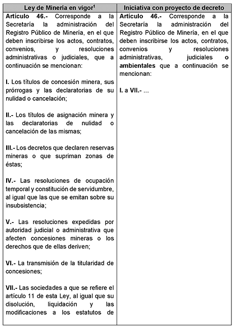 En virtud de lo anterior, y privilegiando este principio de máxima publicidad y de acceso a la información ambiental, es que se propone reformar y adicionar el artículo 46 de la Ley de Minería a fin de que las Manifestaciones de Impacto Ambiental sean integradas en el Registro Público de Minería fortaleciendo la transparencia, permitiendo que autoridades, comunidades e inversionistas accedan a información completa sobre el cumplimiento ambiental de las concesiones.