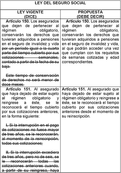 Artículo Único: Se reforman los artículos 150 y 151 de la Ley del Seguro Social, para quedar como sigue: