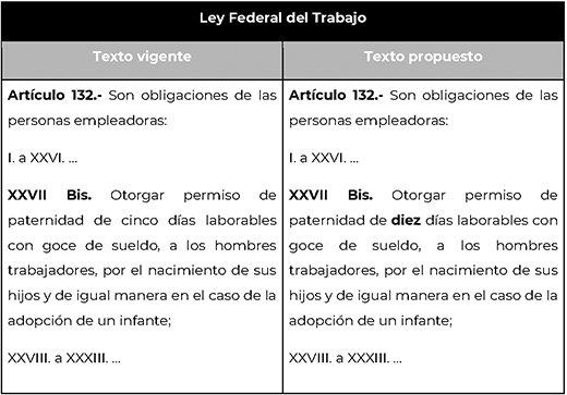 Por ello, la presente iniciativa propone reformar el artículo 132, fracción XXVII Bis, de la Ley Federal del Trabajo, a fin de ampliar el permiso de paternidad a diez días laborables con goce de sueldo, avanzando hacia un modelo de cuidados más justo, equitativo y acorde con los estándares constitucionales e internacionales en materia de derechos humanos, igualdad de género y trabajo digno.