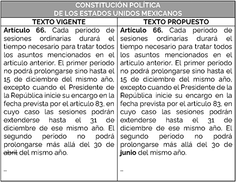 En este sentido, se propone modificar el artículo 66 de la Constitución Política de los Estados Unidos Mexicanos con la finalidad de ampliar el segundo periodo de sesiones ordinarias, para que, en vez de cerrar a más tardar el 30 de abril, se cierre a más tardar el 30 de junio.