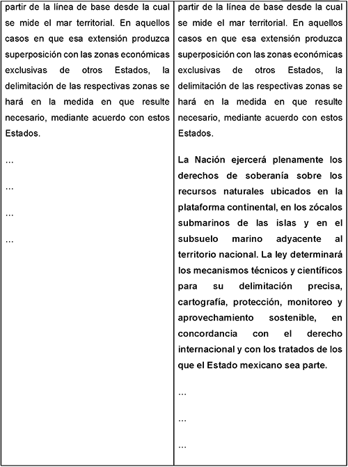 La nación ejercerá plenamente los derechos de soberanía sobre los recursos naturales ubicados en la plataforma continental, en los zócalos submarinos de las islas y en el subsuelo marino adyacente al territorio nacional. La ley determinará los mecanismos técnicos y científicos para su delimitación precisa, cartografía, protección, monitoreo y aprovechamiento sostenible, en concordancia con el derecho internacional y con los tratados de los que el Estado mexicano sea parte.