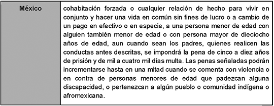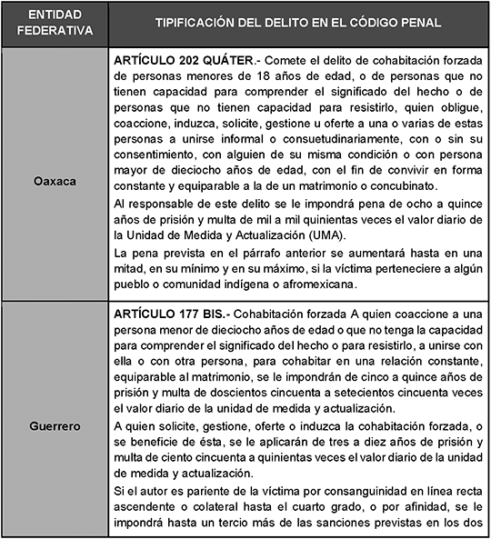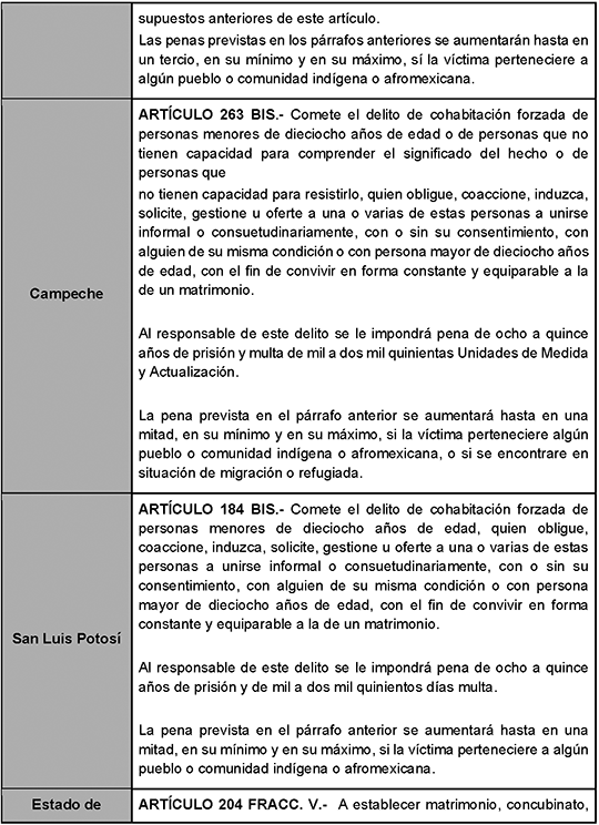 Apesar de los esfuerzos del Congreso de la Unión para proteger la integridad de las niñas y adolescentes del país, existe un rezago legislativo en numerosos estados de la República para castigar la cohabitación forzada. Como ejemplo, solo cinco entidades federativas Oaxaca, Guerrero, Campeche, San Luis Potosí y el Estado de México han tipificado el delito de matrimonio infantil en sus Códigos Penales.