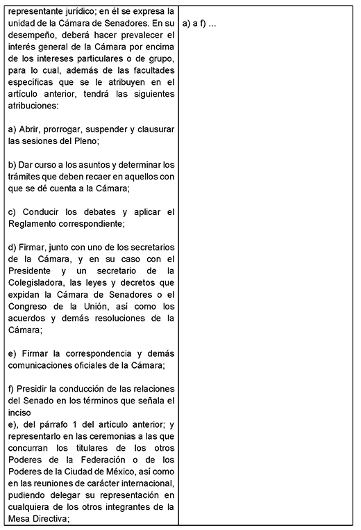 De conformidad con lo anterior, el presidente de la Mesa Directiva ya no actúa en nombre de un partido ni de ideología política alguna. Es la cabeza del órgano interno encargado de conducir, administrar y representar al Senado de México y de mantener relaciones institucionales con la Cámara de Diputados y los otros Poderes de la Unión en el ámbito de la diplomacia parlamentaria.