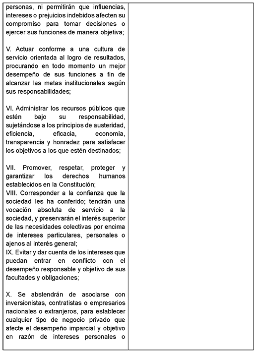 Es oportuno recordar que el Código de Ética de los Servidores Públicos de la Cámara de Senadores, documento propuesto por la Contraloría Interna del Senado de la República,4 en relación a lo establecido en el artículo 66 de la Ley Orgánica del Congreso General de los Estados Unidos Mexicanos que indica que los integrantes de la Mesa Directiva rigen sus actuaciones en apego a la legalidad, imparcialidad y objetividad, señala los principios sobre los que se rige el servicio público en el Senado. De estos es importante destacar los siguientes: