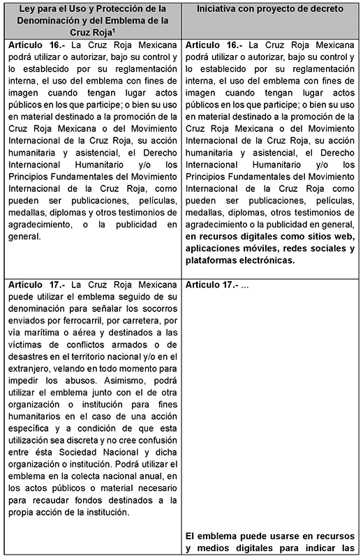A través de la presente iniciativa con proyecto de decreto que propone fortalecer el capítulo relativo al uso indicativo del emblema de la Cruz Roja a fin de regular el uso en medios digitales se propone: