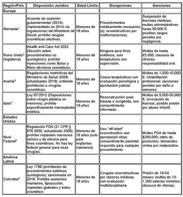 El Consejo de Bioética de Nuffield, en el Reino Unido, ha recomendado una prohibición total de procedimientos cosméticos en menores de 18 años, excepto en contextos multidisciplinarios de atención médica. El siguiente cuadro comparativo distingue algunas legislaciones que regulan la realización de cirugías cosméticas en menores de 18 años: