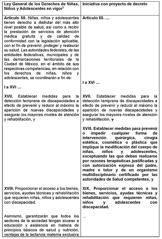 1. En orden a que niñas, niños y adolescentes tienen derecho a disfrutar del más alto nivel posible de salud, se propone reformar el artículo 50 para que las autoridades federales, de las entidades federativas, municipales y de las demarcaciones territoriales de la Ciudad de México, en el ámbito de sus respectivas competencias, establezcan medidas para prevenir o impedir cualquier forma de intervención quirúrgica, cirugía estética, cosmética o plástica que implique la modificación del cuerpo de niñas, niños y adolescentes, exceptuando las que deban realizarse por razones terapéuticas justificadas, y que deben tener el consentimiento informado del padre, la madre o tutor.