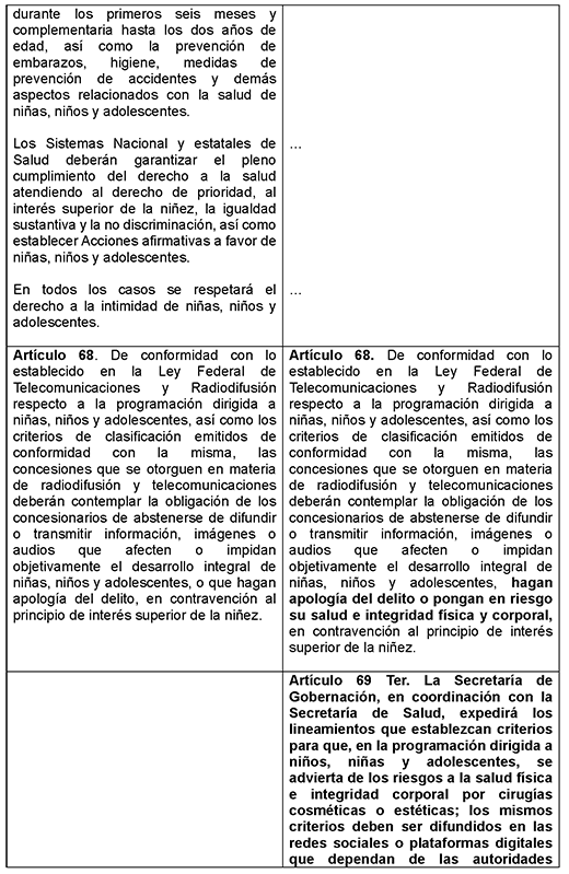 Artículo 69 Ter. La Secretaría de Gobernación, en coordinación con la Secretaría de Salud, expedirá los lineamientos que establezcan criterios para que, en la programación dirigida a niños, niñas y adolescentes, se advierta de los riesgos a la salud física e integridad corporal por cirugías cosméticas o estéticas; los mismos criterios deben ser difundidos en las redes sociales o plataformas digitales que dependan de las autoridades federales, estatales y municipales competentes.