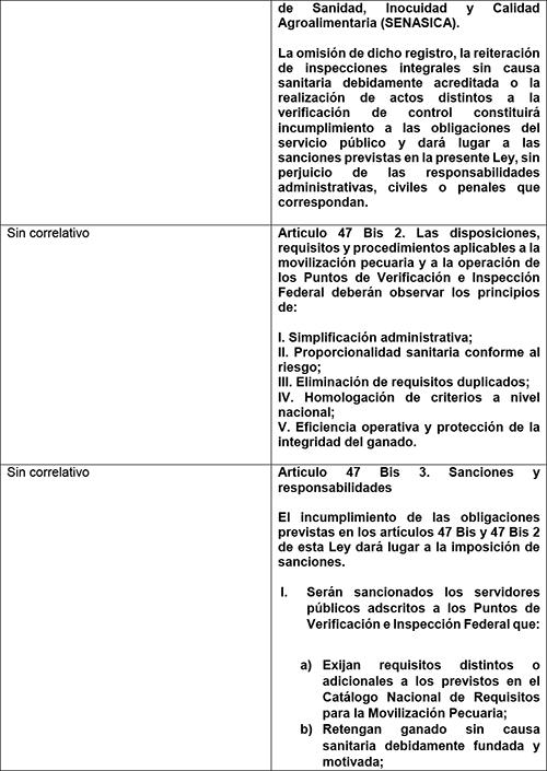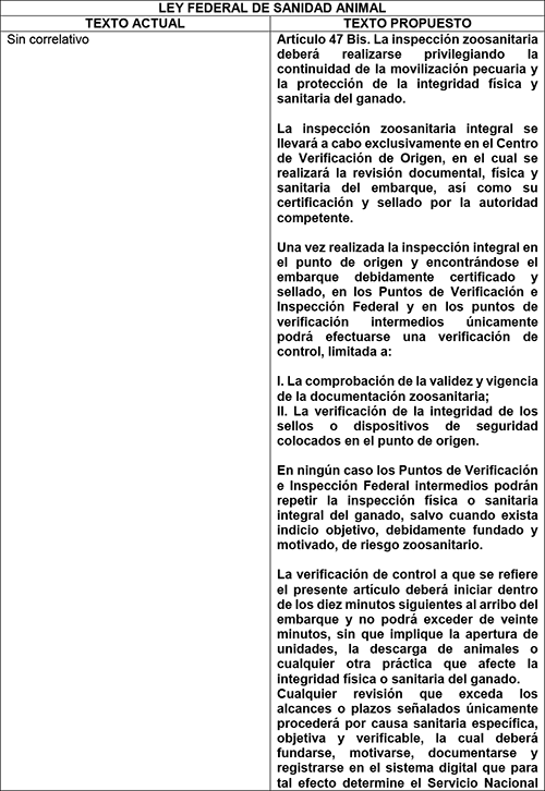 Artículo 47 Bis. La inspección zoosanitaria deberá realizarse privilegiando la continuidad de la movilización pecuaria y la protección de la integridad física y sanitaria del ganado.