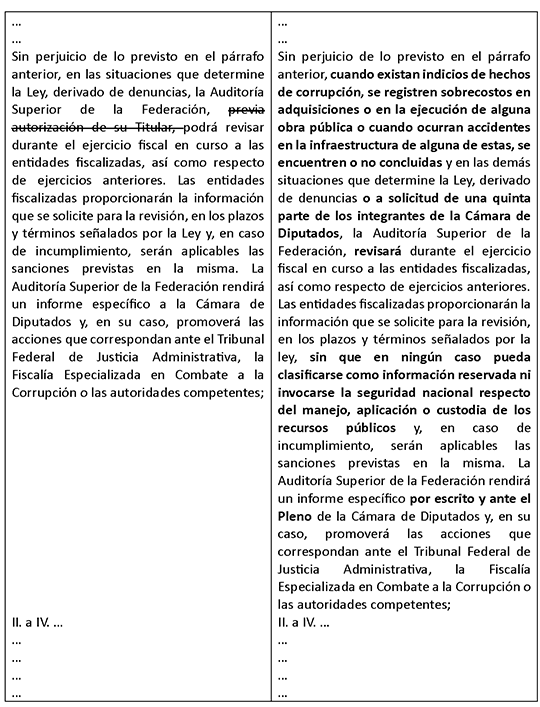 Sin perjuicio de lo previsto en el párrafo anterior, cuando existan indicios de hechos de corrupción, se registren sobrecostos en adquisiciones o en la ejecución de alguna obra pública o cuando ocurran accidentes en la infraestructura de alguna de estas, se encuentren o no concluidas y en las demás situaciones que determine la Ley, derivado de denuncias o a solicitud de una quinta parte de los integrantes de la Cámara de Diputados, la Auditoría Superior de la Federación, revisará durante el ejercicio fiscal en curso a las entidades fiscalizadas, así como respecto de ejercicios anteriores. Las entidades fiscalizadas proporcionarán la información que se solicite para la revisión, en los plazos y términos señalados por la ley, sin que en ningún caso pueda clasificarse como información reservada ni invocarse la seguridad nacional respecto del manejo, aplicación o custodia de los recursos públicos y, en caso de incumplimiento, serán aplicables las sanciones previstas en la misma. La Auditoría Superior de la Federación rendirá un informe específico por escrito y ante el Pleno de la Cámara de Diputados y, en su caso, promoverá las acciones que correspondan ante el Tribunal Federal de Justicia Administrativa, la Fiscalía Especializada en Combate a la Corrupción o las autoridades competentes;