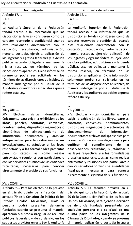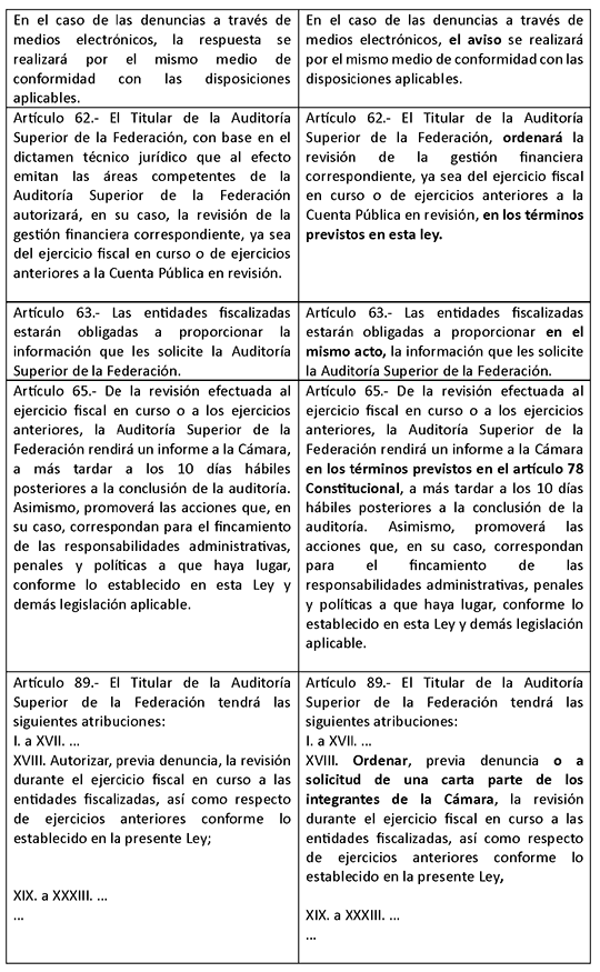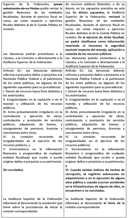 Artículo Primero. Se reforma el segundo párrafo de la fracción XI y la fracción XIV del artículo 17; el primer párrafo del artículo 59; las fracciones IV y V y los párrafos último y penúltimo del artículo 61; el artículo 62; el artículo 63; el artículo 65; y la fracción XVIII del artículo 89; y Se adiciona una fracción VI al artículo 61; todos de la Ley de Fiscalización y Rendición de Cuentas de la Federación, para quedar como sigue:
