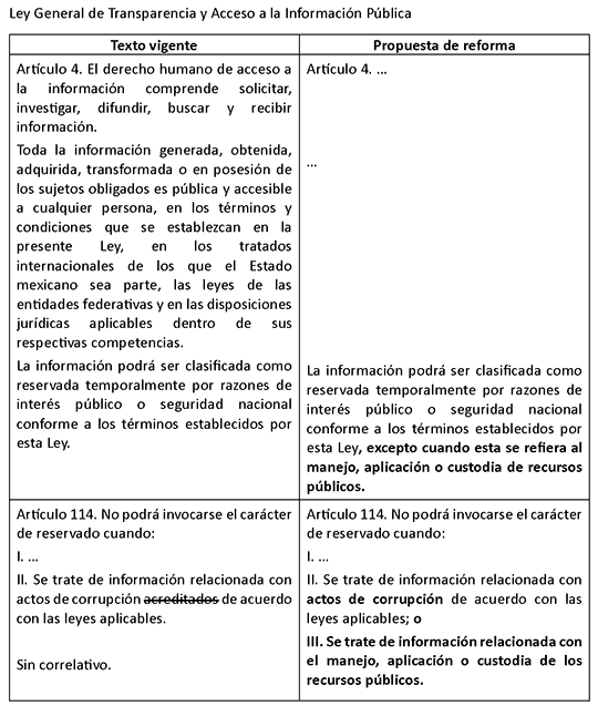De manera complementaria, se presentan reformas a la Ley General de Transparencia y Acceso a la Información Pública, a efecto de precisar la prohibición de clasificar como información reservada ni invocar la seguridad nacional respecto del manejo, aplicación o custodia de los recursos públicos.