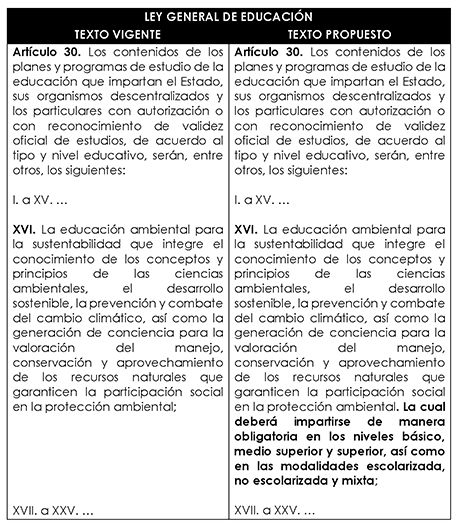 Proyecto de decreto por el que se reforma la fracción XVI del artículo 30 de la Ley General de Educación, en materia de educación ambiental.
