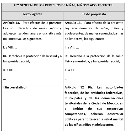 Proyecto de decreto por el que se reforma la fracción IX del artículo 13 y se adiciona un artículo 52 Bis a la Ley General de los Derechos de Niñas, Niños y Adolescentes, en materia de salud mental.