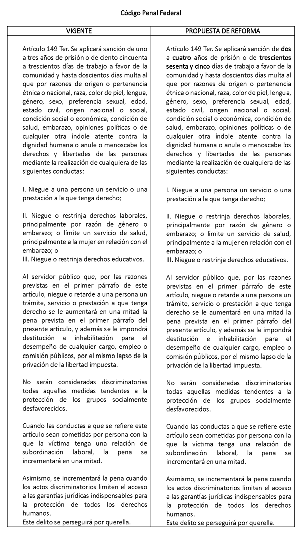 La modificación de la pena prevista en el artículo 149 Ter del Código Penal Federal, para establecer una sanción de dos a cuatro años de prisión o de hasta trescientos sesenta y cinco días de trabajo a favor de la comunidad, fortalecería el combate a la discriminación, garantizaría una protección más efectiva de la dignidad humana y consolidaría un marco jurídico acorde con los principios constitucionales y los estándares internacionales en materia de derechos humanos.