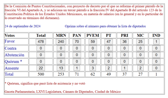 Esta Cámara de Diputados tuvo a bien aprobar en sesión ordinaria del 24 de septiembre de 2024 dicha reforma2 , por unanimidad de 478 votos a favor, incluyendo el respaldo del Grupo Parlamentario del PRI.