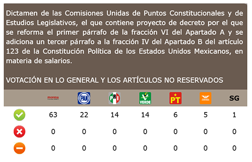 En este contexto, el Congreso de la Unión aprobó recientemente, el proyecto de decreto por el que se reforma el primer párrafo de la fracción VI del Apartado A, y se adiciona un tercer párrafo a la fracción IV del Apartado B del artículo 123 de la Constitución Política de los Estados Unidos Mexicanos, en materia de salarios.
