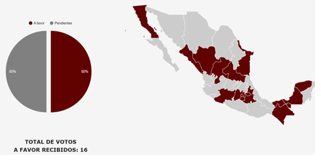 En la página del Senado de la República, se ha hecho de conocimiento público que sólo 16 legislaturas han aprobado al día de hoy la reforma constitucional en comento, las cuales son las siguientes4 : 1) Baja California 2) Campeche 3) Chiapas 4) Ciudad de México 5) Durango 6) México 7) Michoacán 8) Morelos 9) Puebla 10) San Luis Potosí 11) Sinaloa 12) Tabasco 13) Tamaulipas 14) Tlaxcala 15) Yucatán y 16) Zacatecas.