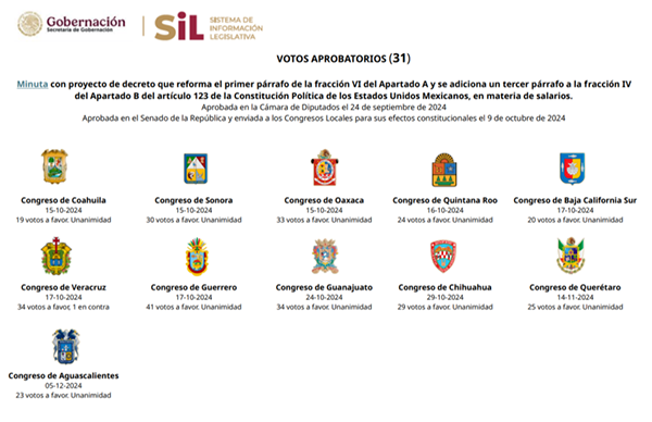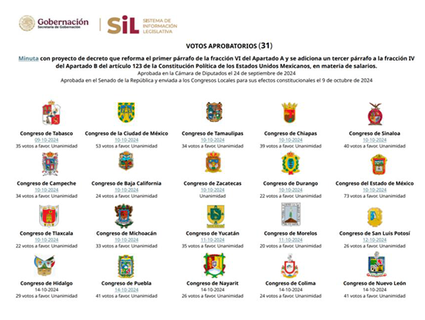 Asimismo, los datos oficiales publicados por la Secretaría de Gobernación en su apartado de Sistema de Información Legislativa, señalan que, contrario a lo publicado en la página del Senado, desde el 14 de octubre de 2024 se reunieron los votos necesarios de los Congresos Locales (17) para emitir formalmente la declaratoria de reforma constitucional de este asunto.