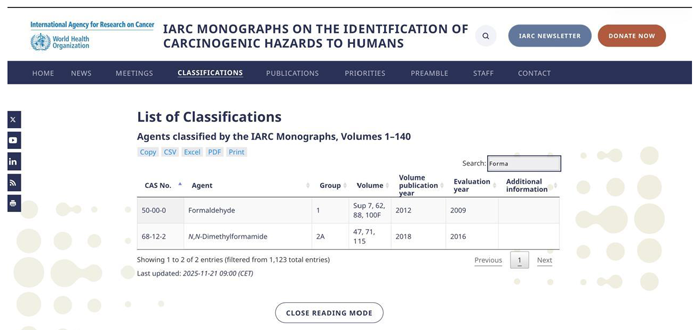 De conformidad con la agencia internacional para Investigación del Cáncer es contundente al clasificar el Formaldehído en el grupo 1 de carcinógeno humano, como se desprende del listado aquí insertado.