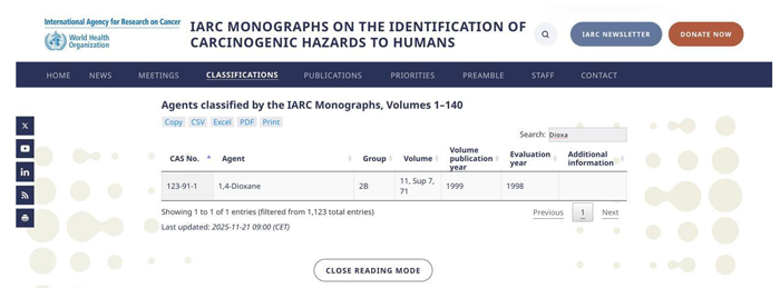 La agencia internacional para Investigación del Cáncer es contundente al clasificar el 1,4 dioxane en el grupo 2B de carcinógeno humano, como se desprende de la lista insertada aquí.