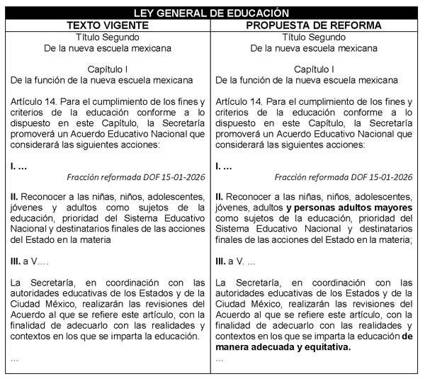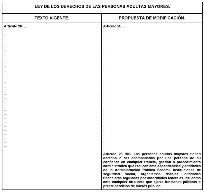 Para mayor claridad se presenta el siguiente cuadro comparativo de la propuesta de decreto por el que se adiciona el artículo 28 Bis a la Ley de los Derechos de las Personas Adultas Mayores: