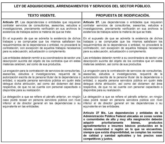 Para mayor claridad se presenta el siguiente cuadro comparativo de la propuesta de decreto por el que se adiciona el artículo 27 Bis a la Ley de Adquisiciones, Arrendamientos y Servicios del Sector Público