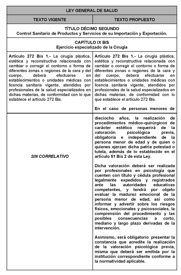 1. Senadora Lilia Margarita Valdez Martínez, del Grupo Parlamentario de Morena, presentó la iniciativa con proyecto de decreto por el que se adicionan los párrafos tercero a la fracción II del artículo 272 Bis y segundo y tercero al artículo 272 Bis 1 de la Ley General de Salud, en materia de cirugías plásticas estéticas en menores de edad.