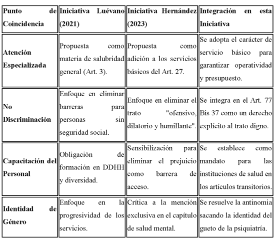 Como se ha expuesto, esta iniciativa es una síntesis superadora de las propuestas de las diputadas Salma Luévano (2021) y Bennelly Hernández (2023). A continuación, se detallan los puntos de coincidencia exacta que han sido integrados en este proyecto: