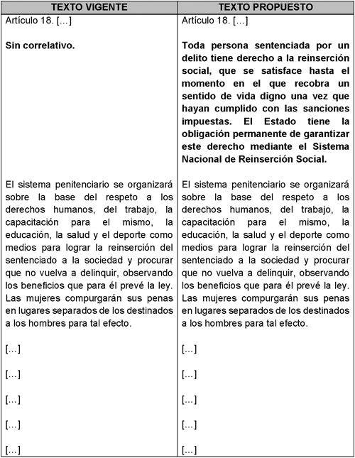 Toda persona sentenciada por un delito tiene derecho a la reinserción social, que se satisface hasta el momento en el que recobra un sentido de vida digno una vez que hayan cumplido con las sanciones impuestas. El Estado tiene la obligación permanente de garantizar este derecho mediante el Sistema Nacional de Reinserción Social.