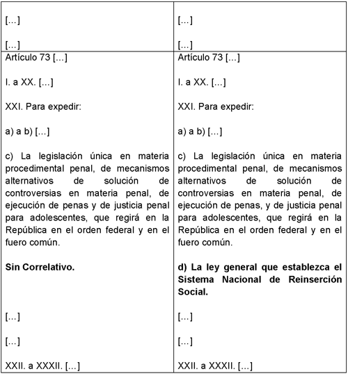 Único. Se adiciona el segundo párrafo, recorriendo los subsecuentes, del artículo 18; y el inciso d) de la fracción XXI del artículo 73; todos, de la Constitución Política de los Estados Unidos Mexicanos, para quedar como sigue: