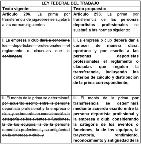 En el marco jurídico vigente, la Ley Federal del Trabajo contempla, en su artículo 296, ciertas disposiciones respecto a la prima por transferencia, pero éstas resultan insuficientes para garantizar una participación justa y proporcional de las personas deportistas profesionales, quienes son el elemento central del espectáculo deportivo y los principales generadores del valor económico involucrado.