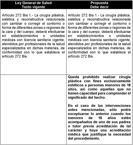 Es en ese sentido que la presente propuesta tiene su fundamento, toda vez que, el texto vigente de la Ley General de Salud, no especifica la necesidad de ser mayor de edad para que un paciente pueda ser candidato a una cirugía con fines exclusivamente estéticos.