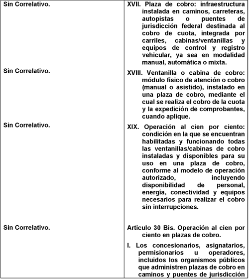Artículo Único. se adicionan las fracciones XVII, XVIII XIX al artículo 2o., los artículos 30 Bis y 30 Ter, así como la fracción VI al artículo 74, de la Ley de Caminos, Puentes y Autotransporte Federal, para quedar como sigue: