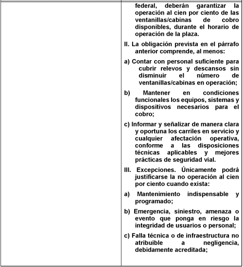 I. Los concesionarios, asignatarios, permisionarios u operadores, incluidos los organismos públicos que administren plazas de cobro en caminos y puentes de jurisdicción federal, deberán garantizar la operación al cien por ciento de las ventanillas/cabinas de cobro disponibles, durante el horario de operación de la plaza.
