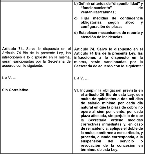 VI. Incumplir la obligación prevista en el artículo 30 Bis de esta ley, con multa de quinientos a dos mil días de salario mínimo por cada día natural en que la plaza de cobro no opere al cien por ciento, por cada plaza afectada, sin perjuicio de que la Secretaría ordene medidas correctivas inmediatas y, en caso de reincidencia, aplique el doble de la multa, conforme a este artículo, y proceda, cuando corresponda, a la suspensión del servicio o revocación de la concesión en términos de esta ley.