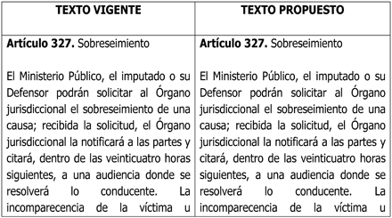 Las condiciones de seguridad en el país nos llevan a considerar adecuaciones a las condiciones del sistema de justicia; el cual actualmente atraviesa una curva de aprendizaje considerable, se ha enfrentado con reformas constitucionales, con rezago de investigaciones. Por lo que tratar de encuadrar la realidad social de las víctimas o denunciantes así como los imputados de un país entero, en alguno de los nueve supuestos contemplados en el artículo 327 del Código Nacional de Procedimientos Penales para aplicar el recurso de sobreseimiento, entendiendo que la finalidad y los alcances del mismo pudieran vulnerar los derechos de alguna de las partes procesales.