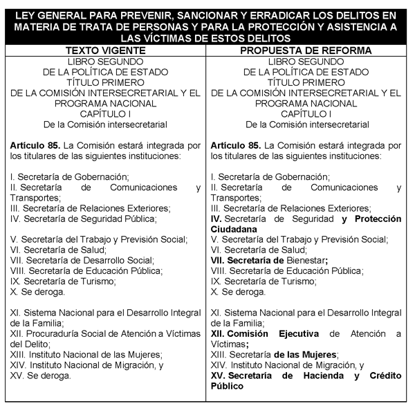 Decreto por el que se reforma el artículo 85 de la Ley General para Prevenir, Sancionar y Erradicar los Delitos en Materia de Trata de Personas y para la Protección y Asistencia a las Víctimas de estos Delitos