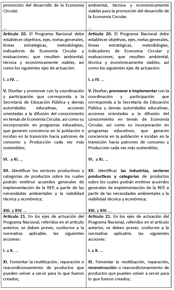 Artículo 20. El Programa Nacional debe establecer objetivos, ejes, metas generales, líneas estratégicas, metodologías, indicadores de Economía Circular y evaluaciones; que resulten ambiental, técnica y económicamente viables, así como los siguientes ejes de actuación: